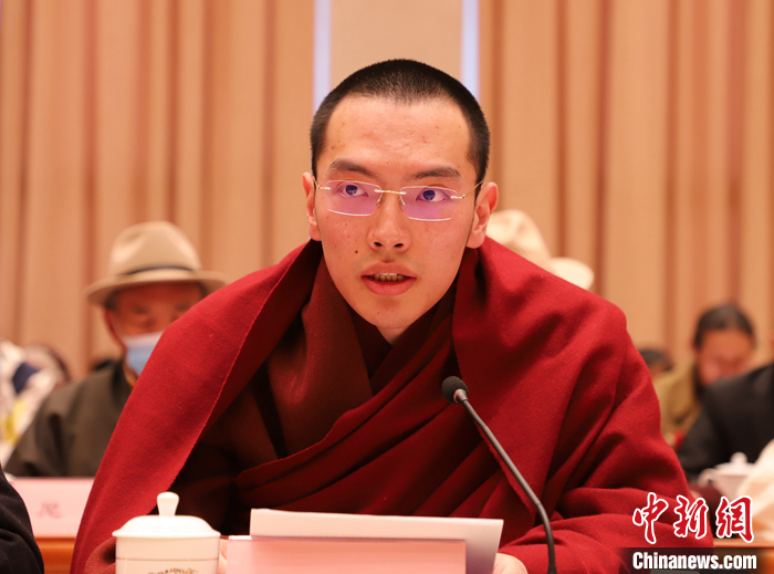 圖為宗教界代表達(dá)隆夏仲·阿旺洛?!さ┰銮岈斣谧剷?huì)上發(fā)言。 中新社記者 趙延 攝