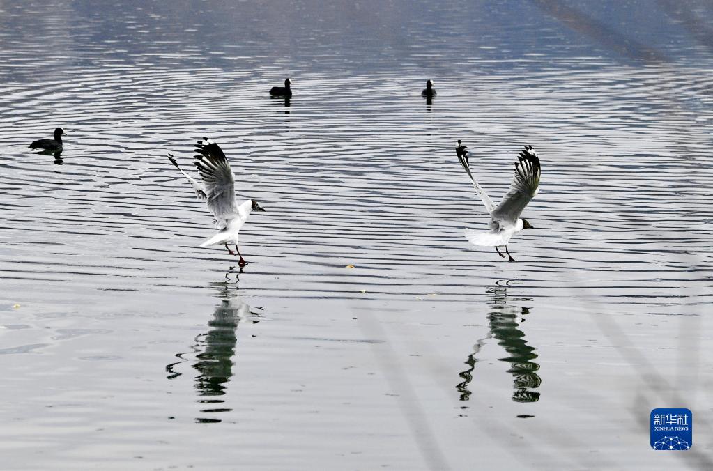 棕頭鷗活躍在拉魯濕地的水面上(3月30日攝)。新華社記者 張汝鋒 攝