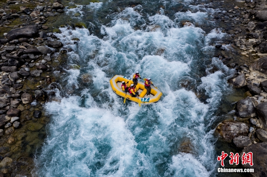 圖為激流漂流筏追逐賽比賽現(xiàn)場。(無人機照片)中新社記者 貢嘎來松 攝