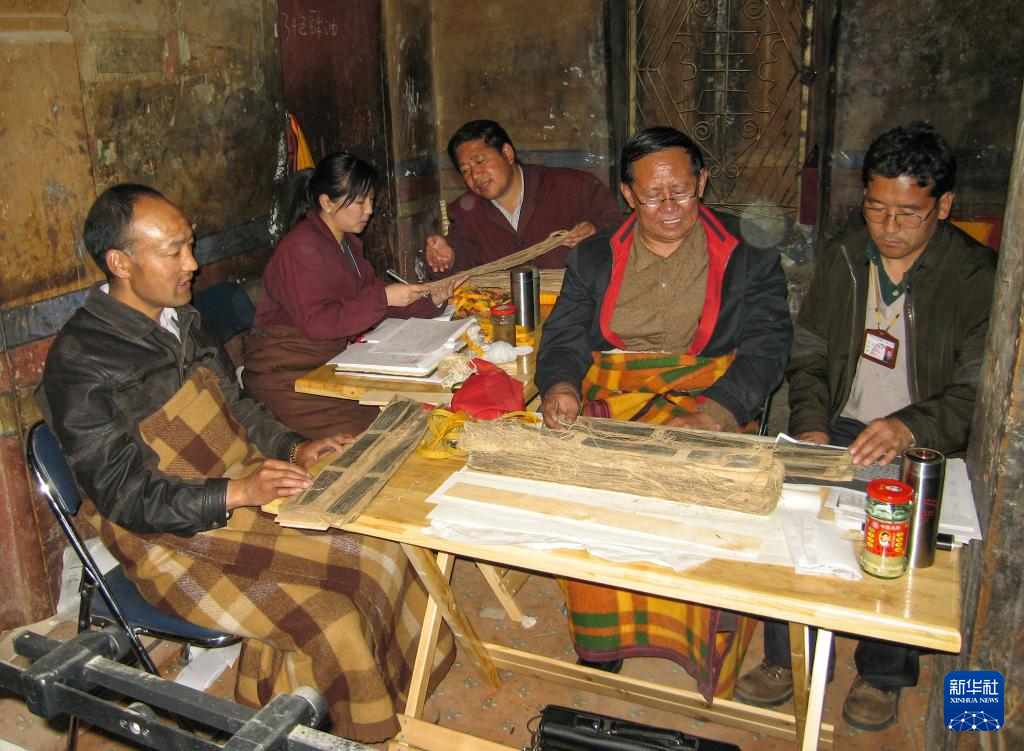久米次成(左一)在布達拉宮整理館藏貝葉經(jīng)(2008年5月12日攝)。新華社發(fā)