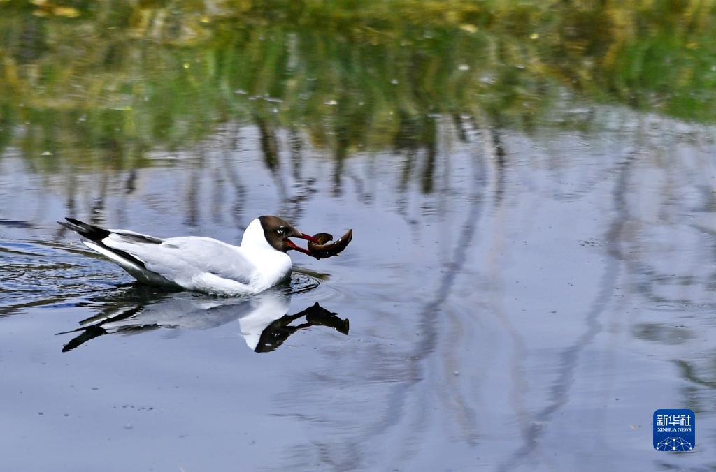 拉魯濕地水面上叼著泥鰍的棕頭鷗(5月6日攝)。新華社記者 張汝鋒 攝