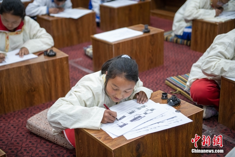 5月7日,西藏山南市,加查縣中學(xué)學(xué)生在上藏文書法興趣班。該興趣班由2名藏文教師任教,每周兩課時,利用自習(xí)課或晚自習(xí)時間為學(xué)生和教師授課。課程內(nèi)容包含執(zhí)筆、運(yùn)筆、姿勢等基礎(chǔ)書寫技能,以及藏文中的烏金體、珠擦體、簇仁體、簇通體等各類字體的書寫方法。