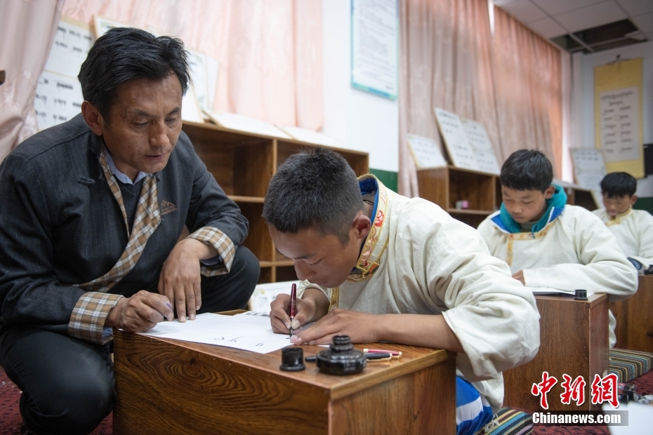 5月7日,西藏山南市,加查縣中學(xué)藏文書法興趣班的教師扎西達(dá)瓦給學(xué)生們上課。該興趣班由2名藏文教師任教,每周兩課時,利用自習(xí)課或晚自習(xí)時間為學(xué)生和教師授課。課程內(nèi)容包含執(zhí)筆、運(yùn)筆、姿勢等基礎(chǔ)書寫技能,以及藏文中的烏金體、珠擦體、簇仁體、簇通體等各類字體的書寫方法。