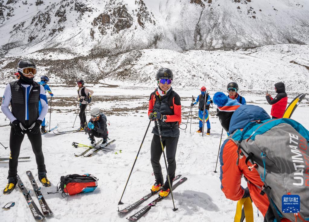 在西藏拉薩市當雄縣羊八井鎮(zhèn),玉珍拉姆(左二)和隊友進行滑雪登山訓練(5月2日攝)。新華社記者 孫非 攝