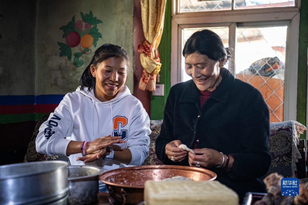 在位于西藏林芝市工布江達縣仲莎鄉(xiāng)的家中,玉珍拉姆(左)和媽媽一起做土豆包子(4月24日攝)。新華社記者 孫非 攝