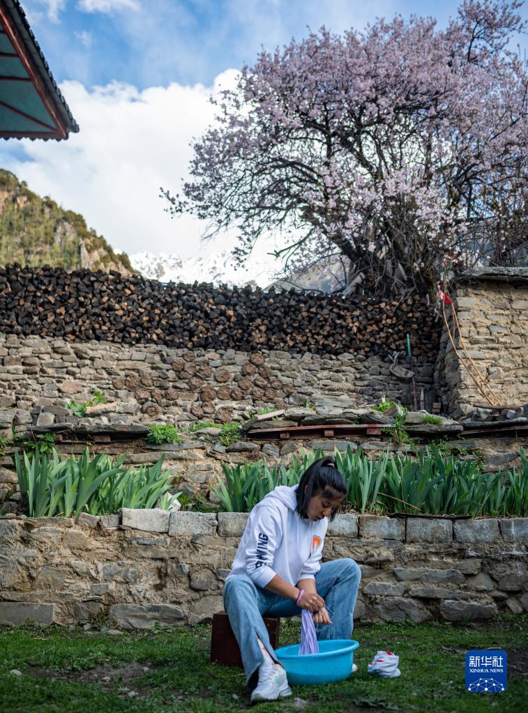 在位于西藏林芝市工布江達縣仲莎鄉(xiāng)的家中,玉珍拉姆在院子里洗衣服(4月24日攝)。新華社記者 孫非 攝