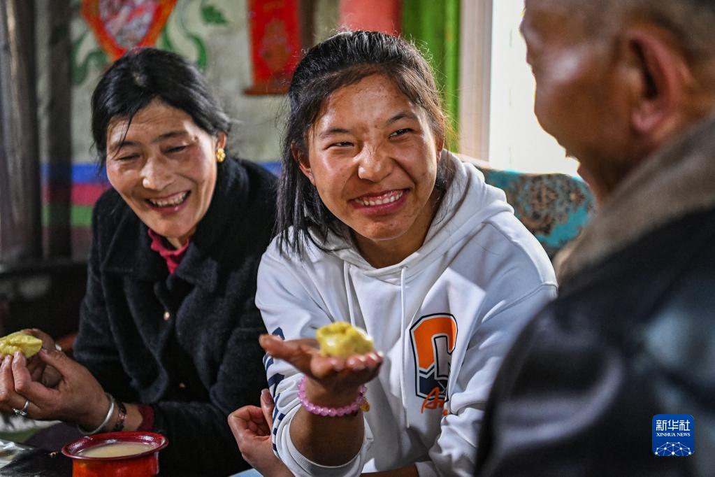 在位于西藏林芝市工布江達縣仲莎鄉(xiāng)的家中,玉珍拉姆(中)向爸爸展示自己做的土豆包子(4月24日攝)。新華社記者 孫非 攝