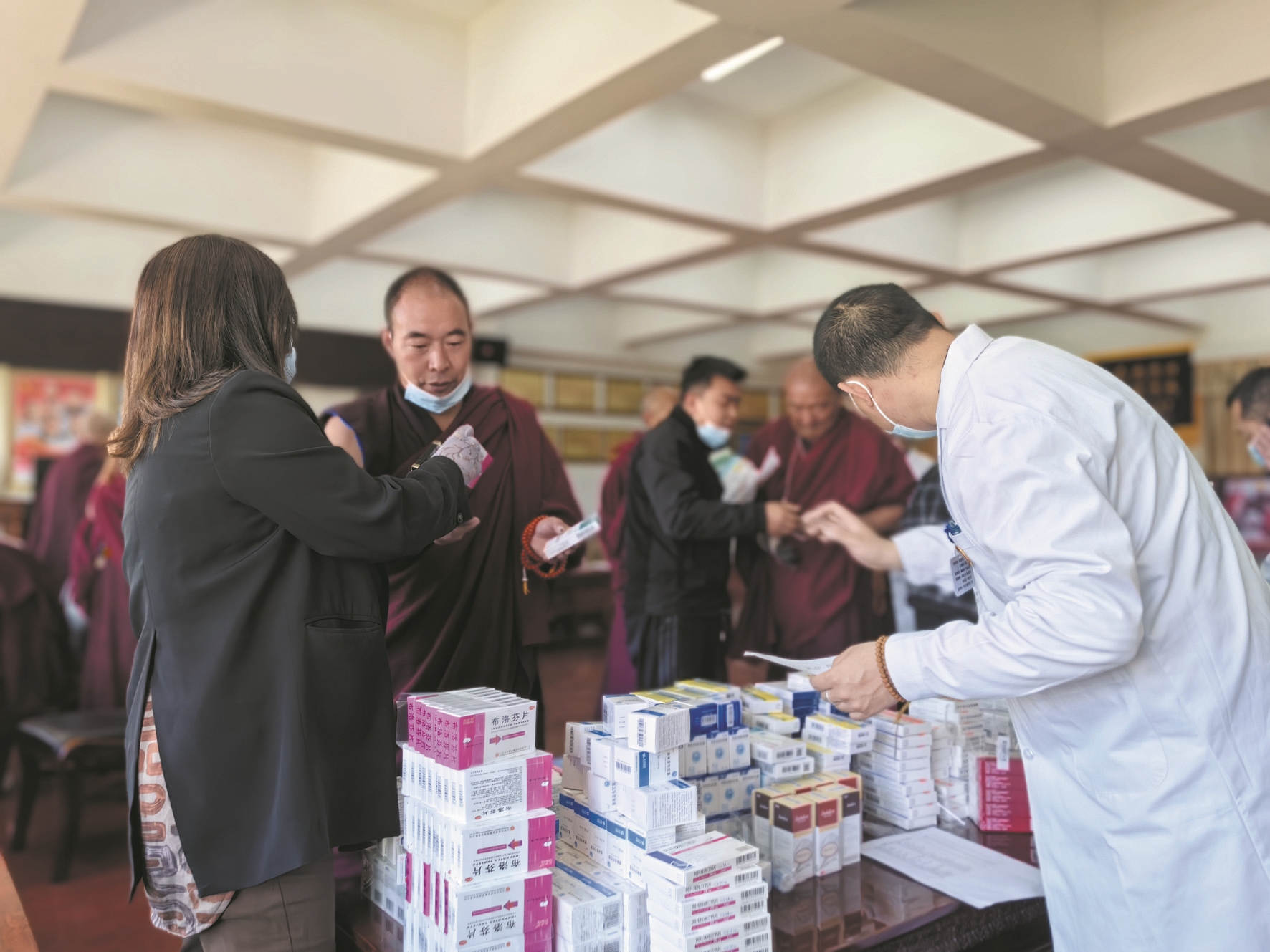 圖為義診現(xiàn)場(chǎng),北京市第八批援藏醫(yī)療隊(duì)的醫(yī)務(wù)人員熱情接待前來(lái)就診和咨詢的僧人,并發(fā)放藥物。 拉薩融媒記者 拉姆次仁攝