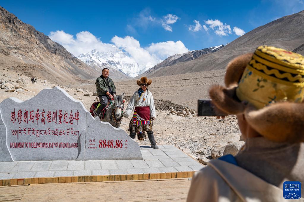 在珠峰大本營的珠峰高程測量紀念碑前,游客拍照留念(5月20日攝)。新華社記者 孫非 攝