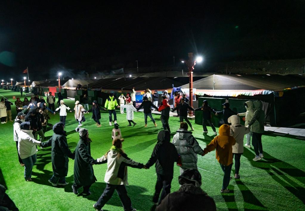 在珠峰游客大本營,游客們?cè)趲づ衤灭^間的空地上唱歌跳舞(5月16日攝)。新華社記者孫非 攝