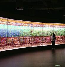 唐卡藏語(yǔ)意為“卷軸畫”,常見的唐卡作品長(zhǎng)寬都在1米左右,這幅長(zhǎng)618米的巨幅唐卡尺寸之大,實(shí)屬罕見。整幅作品由金銀、珊瑚、瑪瑙、珍珠、綠松石等純天然礦物配制的顏料繪制而成,上下裝飾的堆繡圖案達(dá)3000多種。藏文化博物院用四層整層對(duì)其進(jìn)行了完整展示,蜿蜒曲折的展線讓人仿佛徜徉于歷史長(zhǎng)河。