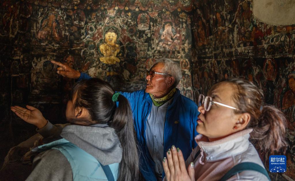 5月26日,仁增旺扎老人(中)在為游客介紹壁畫。新華社記者 費茂華 攝