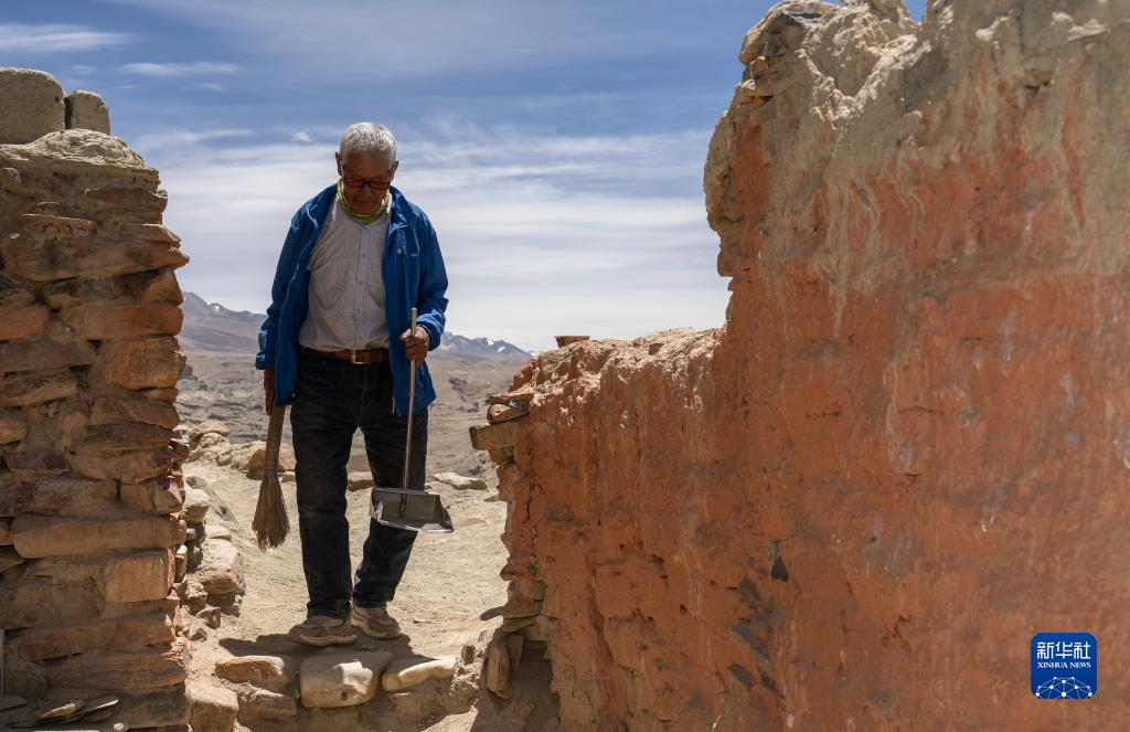 5月26日,仁增旺扎老人準備打掃石窟。新華社記者 費茂華 攝