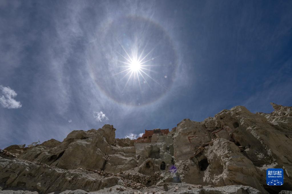 5月26日,日暈出現(xiàn)在皮央石窟群所在的小山上空。新華社記者 費茂華 攝