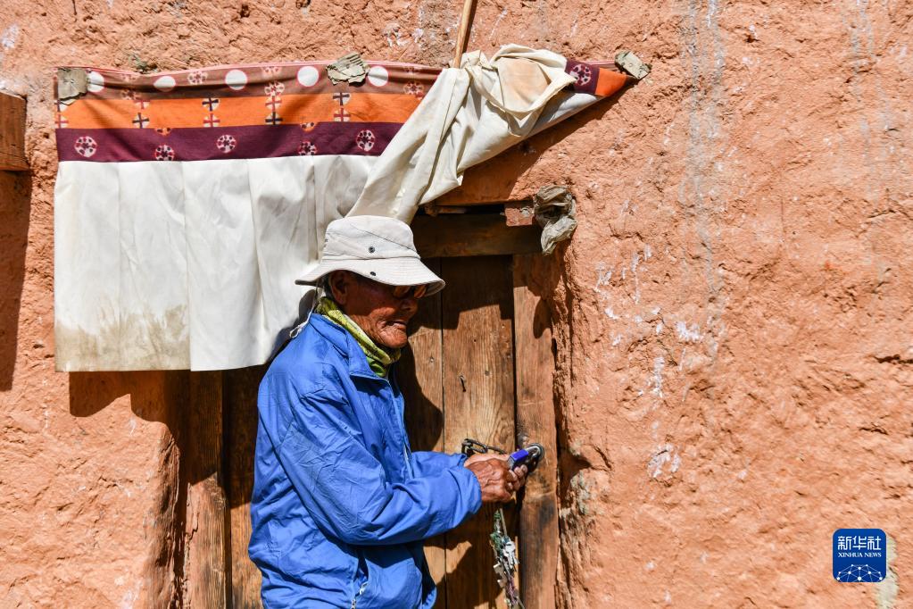 仁增旺扎老人打開其中一間還留存有壁畫的石窟大門(5月26日攝)。新華社記者 晉美多吉 攝
