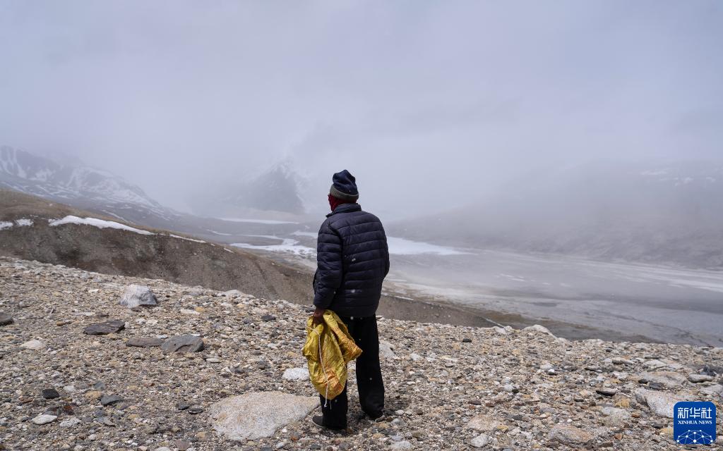 乃乃在用望遠(yuǎn)鏡查看冰川是否有異樣(5月31日攝)。新華社記者 晉美多吉 攝