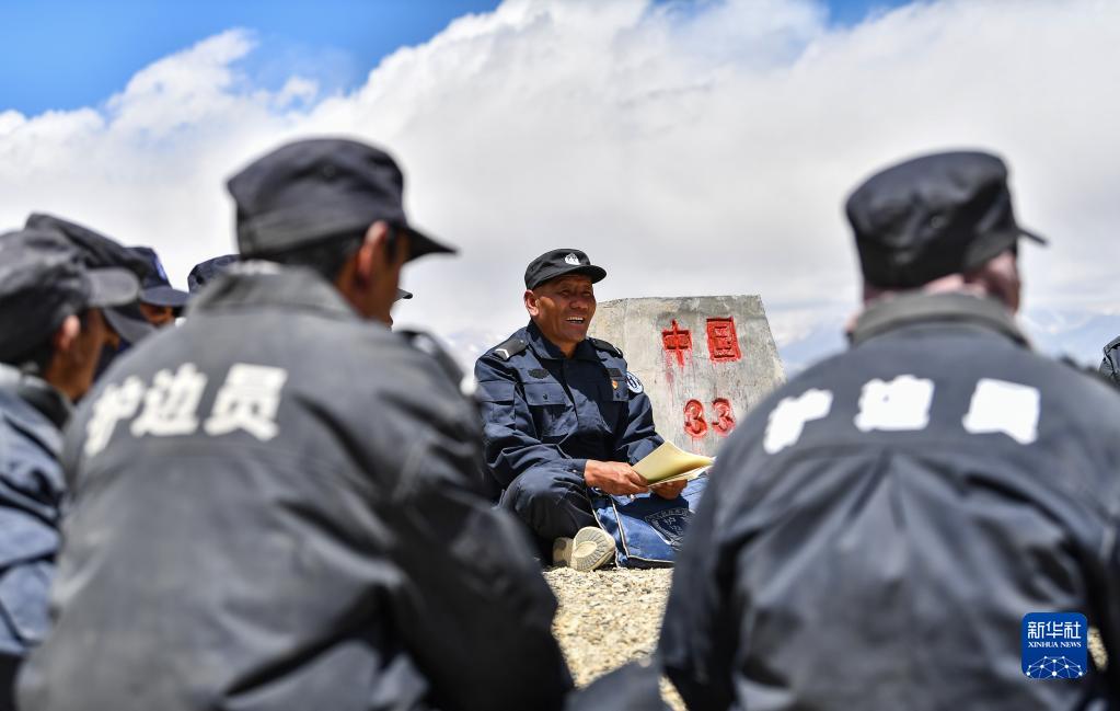 6月2日,在33號(hào)界樁處,護(hù)邊聯(lián)防隊(duì)在隊(duì)長(zhǎng)石角(右二)的帶領(lǐng)下學(xué)習(xí)。新華社記者 晉美多吉 攝