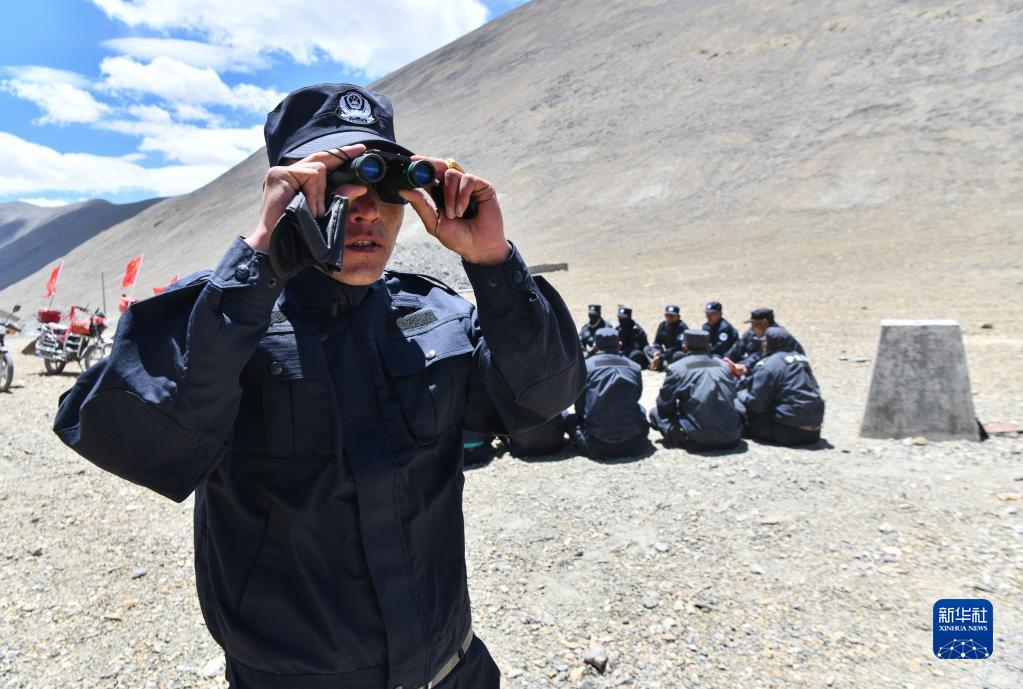 6月2日,在33號(hào)界樁處,一名護(hù)邊聯(lián)防隊(duì)隊(duì)員使用望遠(yuǎn)鏡巡查。新華社記者 晉美多吉 攝
