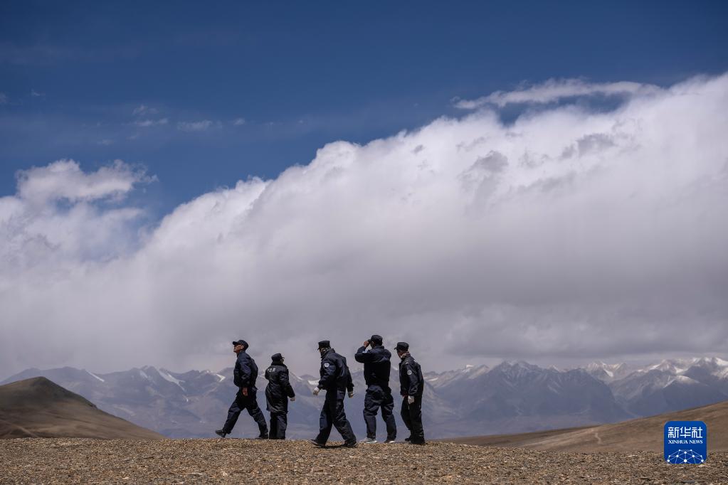 6月2日,石角(右二)帶領(lǐng)護(hù)邊聯(lián)防隊(duì)隊(duì)員在33號(hào)界樁附近巡邏。新華社記者 費(fèi)茂華 攝