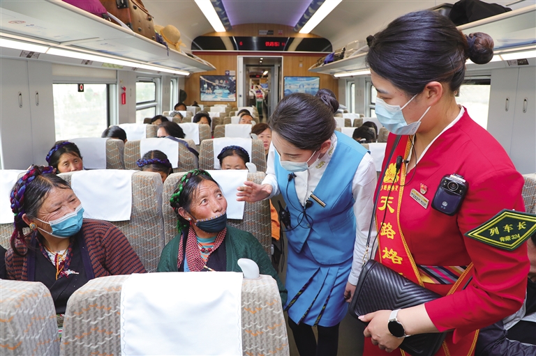 2022年初,青藏集團(tuán)有限公司在管內(nèi)各站、車開展“天路格?;ā逼放苿?chuàng)建以來(lái),拉林鐵路各車站、各次列車上都能看到“天路格?;ā狈?wù)隊(duì)員,他們用真誠(chéng)、熱情、熱心為每一位旅客提供溫馨細(xì)致的服務(wù)?!?月初,我?guī)е⒆觼?lái)西藏旅游,6月20日前往林芝,游玩了三天,由于家里有事,不得不趕回去,就買了今天中午回拉薩的火車票,剛開車不久我姑娘就發(fā)燒,肚子痛。列車員看見孩子難受就詢問情況,并找來(lái)列車長(zhǎng)周晶,通過廣播為我們找醫(yī)生,還好沒啥大事,就是腸胃感冒,我也就放心了。周晶車長(zhǎng)也一直在旁邊幫我照顧孩子,拿濕毛巾擦臉,蓋毛毯,送來(lái)熱水,太細(xì)心了,讓我很感動(dòng)。她們工作認(rèn)真負(fù)責(zé),服務(wù)周到,我一路上都親身感受到了高原動(dòng)車的熱情?!痹?4日林芝到拉薩的C926次列車上,來(lái)自四川的高雅女士拉著記者激動(dòng)地說。