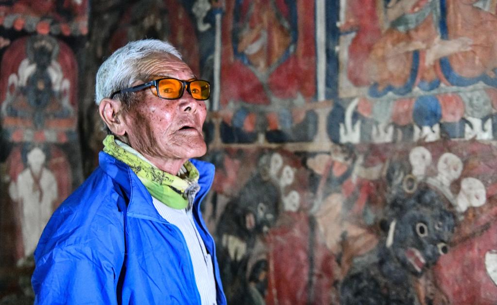 仁增旺扎老人查看壁畫(huà)(5月26日攝)。新華社記者 晉美多吉 攝