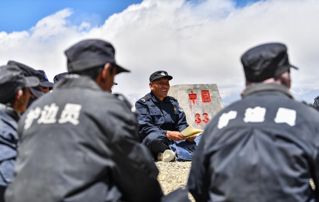 在33號(hào)界碑處,護(hù)邊隊(duì)在隊(duì)長(zhǎng)的帶領(lǐng)下開(kāi)展學(xué)習(xí)(6月2日攝)。新華社記者 晉美多吉 攝