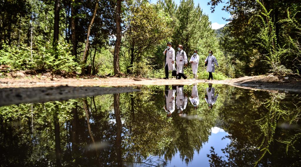 往返于村間的王振疆(左二)與隊(duì)員王彤旭(左一)、陳冰(右)及當(dāng)?shù)蒯t(yī)生尼瑪益西(右二)(6月12日攝)。新華社記者 晉美多吉 攝