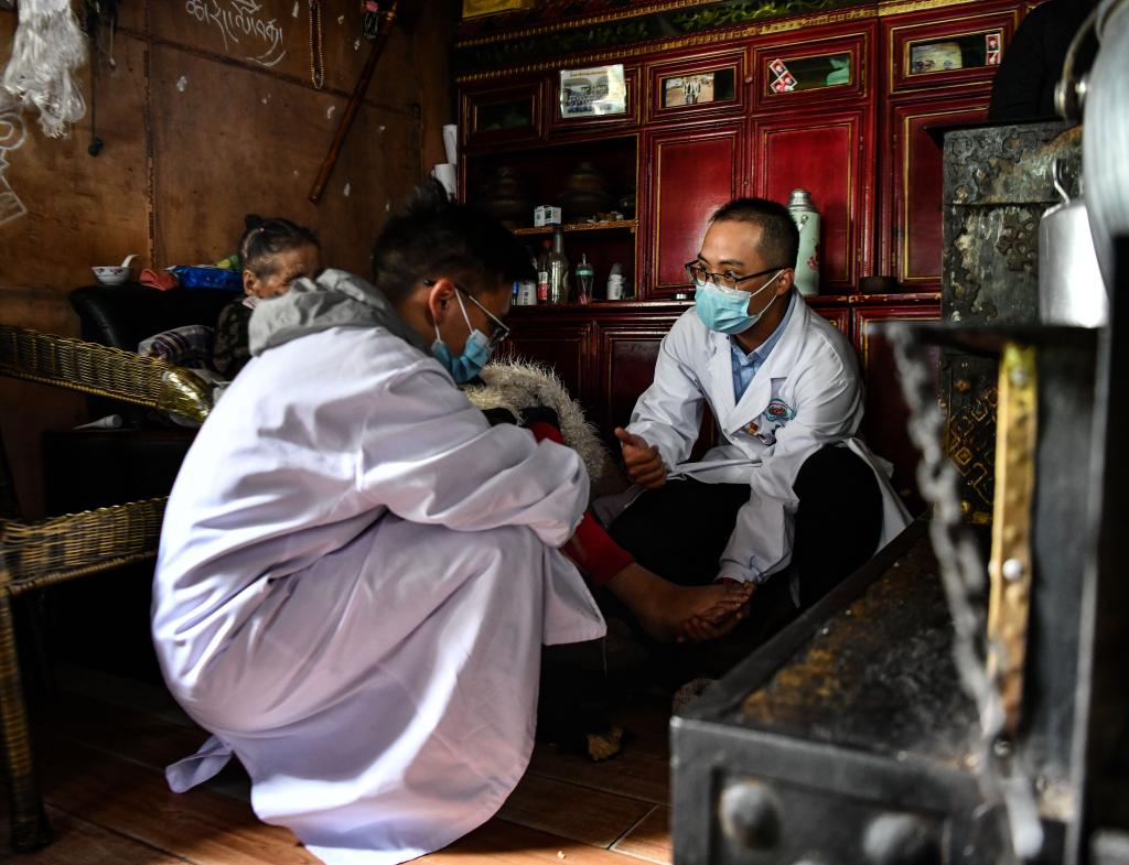 在米林的叢林中,珠海市人民醫(yī)院的援藏醫(yī)生王振疆手捧著病人的腳,仔細(xì)詢問(wèn)病人的身體狀況,送去了援藏省市的關(guān)心,送去了藏漢一家親的問(wèn)候。