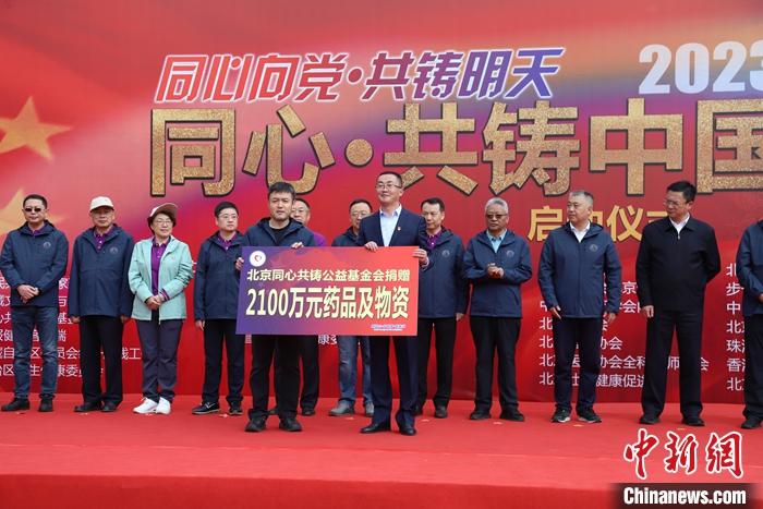 圖為啟動(dòng)儀式上,北京同心共鑄公益基金會(huì)向昌都市捐贈(zèng)了價(jià)值2100萬元人民幣的藥品及物資。 中新社發(fā)  “同心·共鑄中國心”組委會(huì)宣傳處 供圖