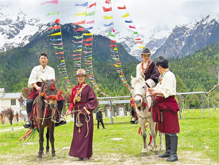 波密縣扎木鎮(zhèn)康木村坐落于318國道旁,風景秀麗,群山環(huán)繞,很多自駕游的游客都會經(jīng)停于此體驗藏家文化。圖為游客在康木村,穿著藏裝體驗騎馬樂趣。 圖片由記者 張猛 攝