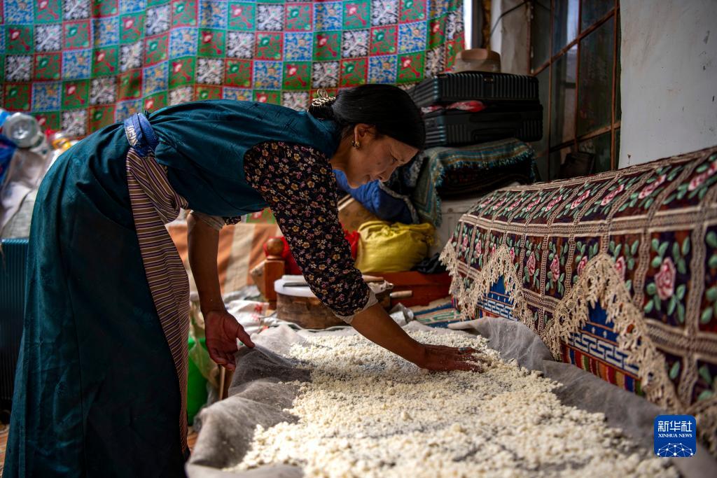 多爾格村村民達(dá)娃在家里制作奶渣(7月11日攝)。新華社記者 姜帆 攝