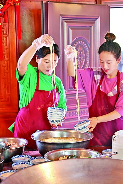 加加面是芒康鹽井的一種美食,顧名思義就是“不停地加”。圖為當(dāng)?shù)匕傩罩谱骷蛹用?。光明日報記?劉宇航攝