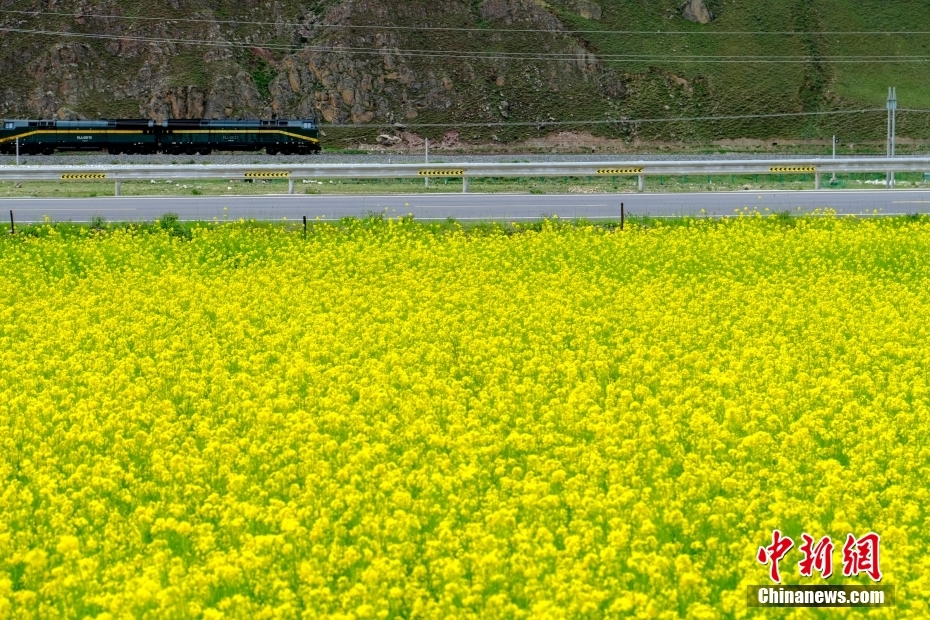7月24日,青藏鐵路火車通過(guò)堆龍曲沿岸的油菜花田。