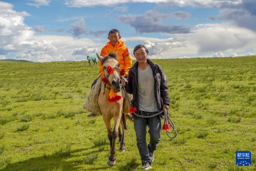 列熱覺(jué)旦騎著馬,他的父親次扎達(dá)牽著馬行走在草原上(8月9日攝)。新華社記者 邵澤東 攝