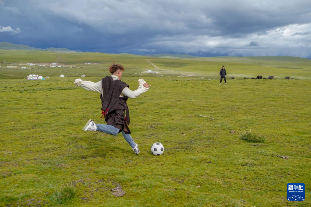 8月11日,旦增旺久和朋友在草原上踢足球。旦增旺久是次扎達(dá)兒子列熱覺(jué)旦的表哥,遠(yuǎn)在千里之外的湖南上學(xué),但還會(huì)經(jīng)常想起“隆達(dá)熱巴”。正值暑假,回到草原的他會(huì)細(xì)心地為“隆達(dá)熱巴”梳毛,跟它說(shuō)悄悄話。新華社記者 邵澤東 攝