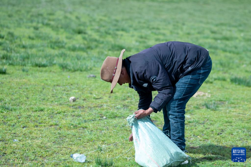 8月11日,次扎達(dá)在轉(zhuǎn)換牧場(chǎng)時(shí)撿拾生活垃圾。新華社發(fā)(旦增努布攝)