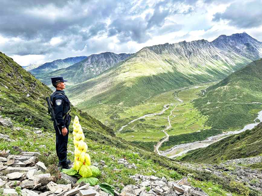 西藏山南曲桑邊境檢查站的民警們在巡邏路上發(fā)現(xiàn)了它,這種植物扎根10年至45年,只為一生開一次花,它矗立在海拔5000米的高山之巔,屹立挺拔,花開燦爛,就像山下檢查站的西藏移民管理警察。