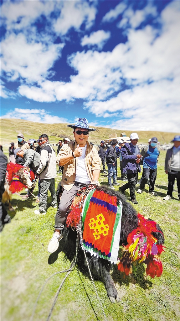圖為來自湖南的游客李先生在牧人節(jié)賽牦牛項目中,體驗騎牦牛的刺激與歡樂。見習(xí)記者 武沛濤 攝