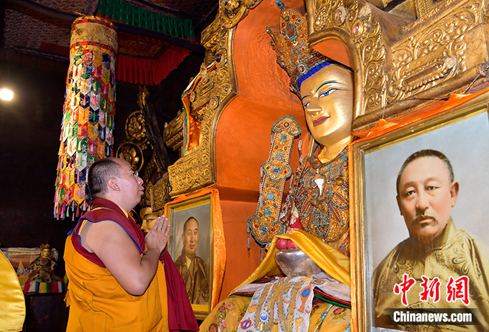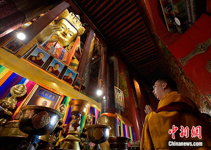 9月13日,班禪在扎什倫布寺強巴佛殿朝拜強巴佛。中新社記者 李林 攝