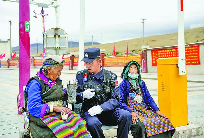 圖為曲崗邊境檢查站民警在巡邏途中與路邊休息的老人交談。記者 趙文慧 通訊員 巴桑頓珠 白瑪倉覺 攝