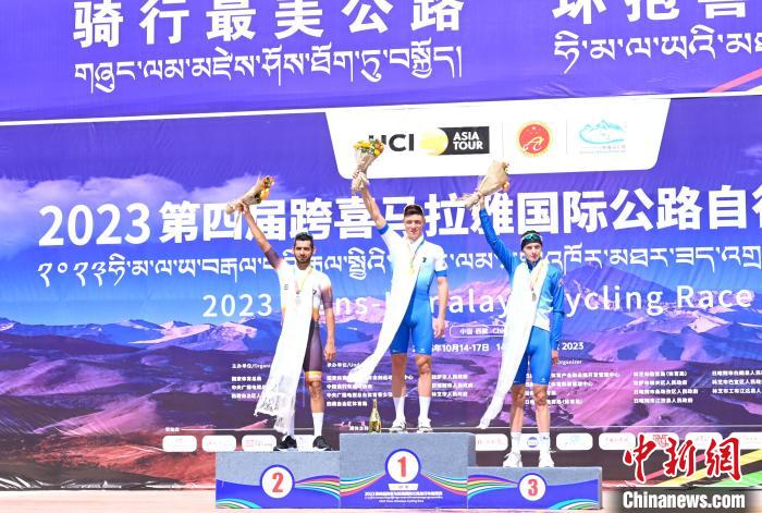 10月14日,第一賽段(林芝)前三名站上領(lǐng)獎(jiǎng)臺(tái)。中新社記者 趙朗 攝
