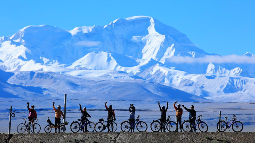游客們騎行至卓奧友峰前合影。(資料圖片)