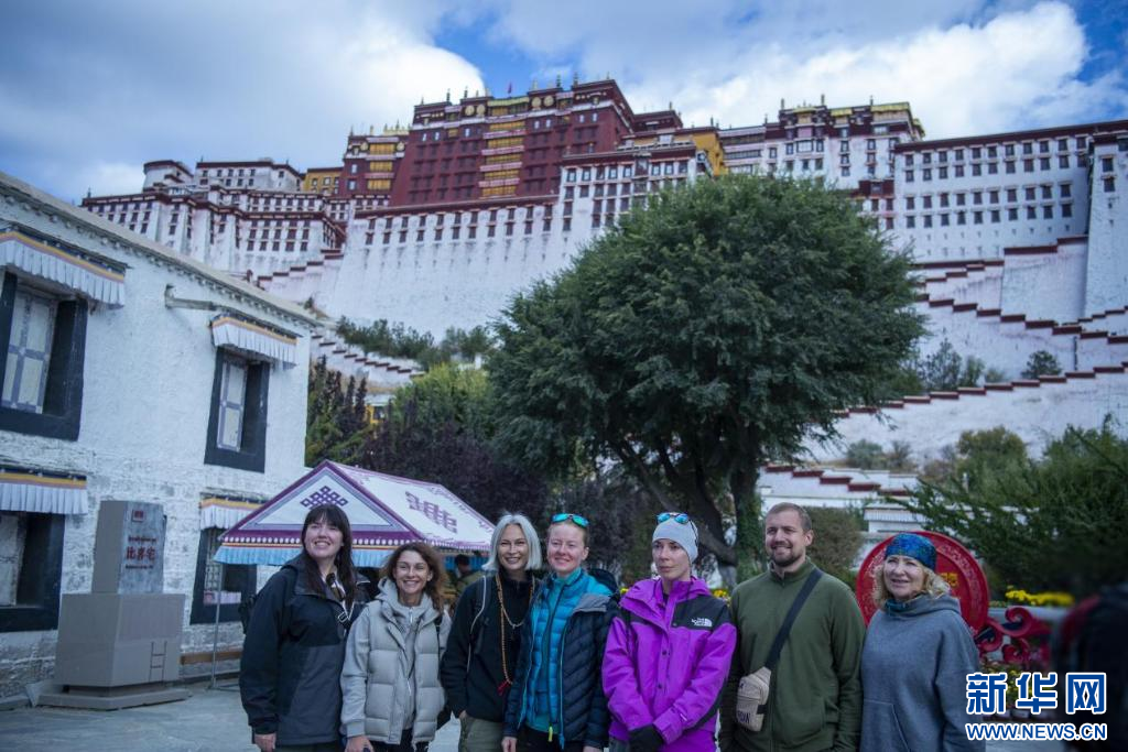 10月18日,外國游客在布達拉宮前合影留念。新華網(wǎng) 旦增努布 攝