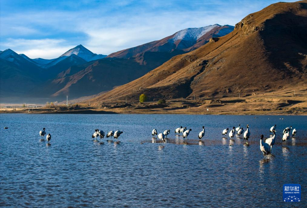 這是在拉薩市林周縣虎頭山水庫拍攝的越冬黑頸鶴(10月24日攝)。新華社記者 姜帆 攝