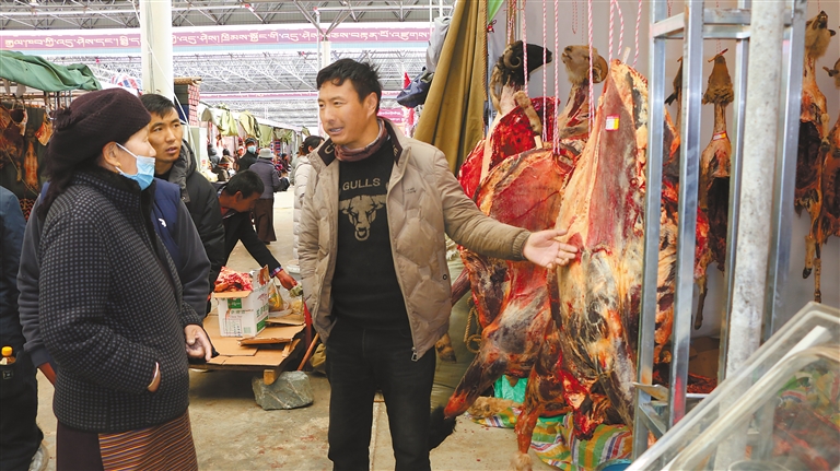 圖為顧客向商家了解牦牛肉價(jià)格。