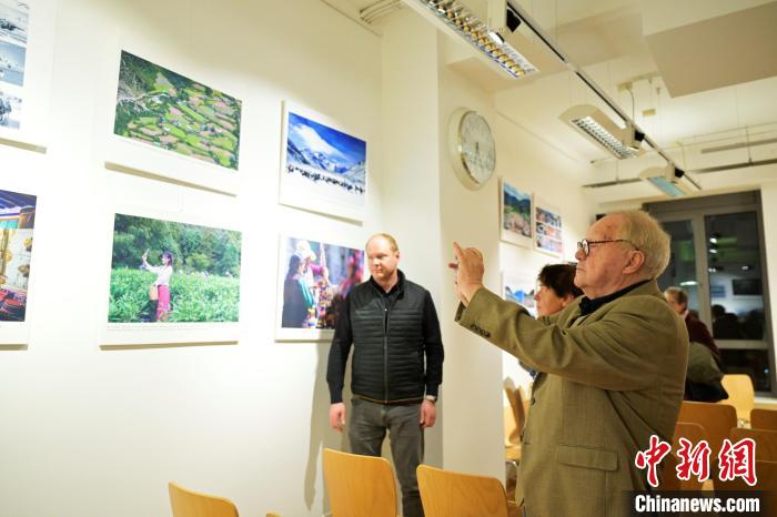 維也納商會市場部主席馬庫斯·漢茨(Markus Hanzl)參觀“和美西藏”攝影展。歐洲時報記者 周修怡 攝