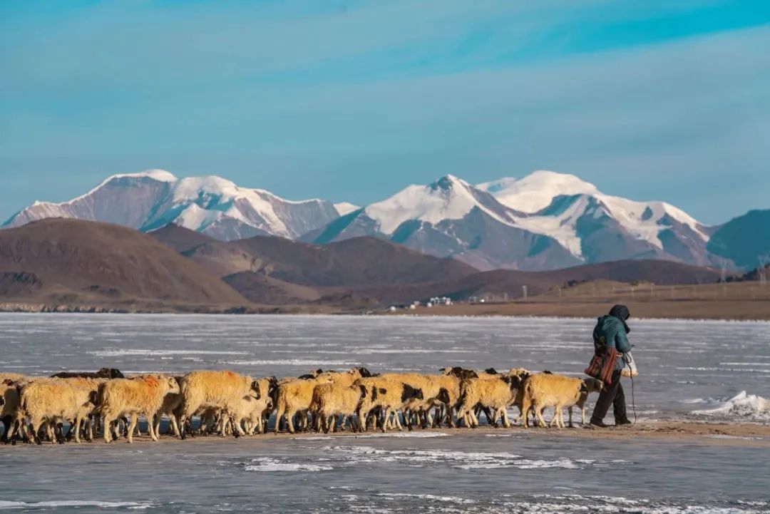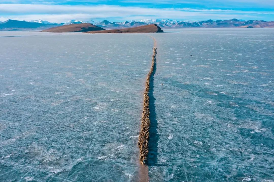 它是世界上海拔最高的村落之一,當(dāng)?shù)卮迕穸家苑拍翞樯:瑏砼R,岸上的牧場草料已經(jīng)不夠羊群過冬,推瓦村的村民們把羊群集結(jié)在一起,在冰湖上撒牛糞爐灰,畫出一道冰面上的“羊腸小道”把羊群趕上普姆雍錯湖心島上吃草過冬,雖然只有幾公里的距離,但這個傳承千年的畫面卻給人以史詩般的震撼與感動。