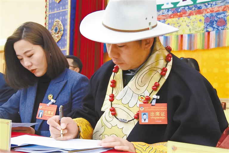 圖為基層委員認真聆聽政協(xié)拉薩市委員會工作報告。