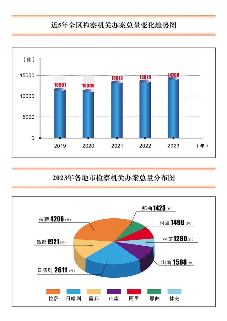 “2023年,全區(qū)檢察機(jī)關(guān)在自治區(qū)黨委和最高檢正確領(lǐng)導(dǎo)下,以習(xí)近平新時(shí)代中國(guó)特色社會(huì)主義思想為指導(dǎo),深入貫徹習(xí)近平法治思想、習(xí)近平總書(shū)記關(guān)于西藏工作的重要指示和新時(shí)代黨的治藏方略,全面貫徹黨的二十大精神、自治區(qū)第十次黨代會(huì)和十屆區(qū)黨委歷次全會(huì)精神、全國(guó)檢察長(zhǎng)會(huì)議精神,認(rèn)真落實(shí)自治區(qū)十二屆人大一次會(huì)議決議,自覺(jué)把檢察工作放到黨的治藏穩(wěn)藏興藏大局中謀劃推進(jìn),聚焦‘四件大事’聚力‘四個(gè)創(chuàng)建’,忠誠(chéng)依法能動(dòng)高質(zhì)效履職取得新成效。全年辦理各類(lèi)法律監(jiān)督案件14708件,同比增長(zhǎng)6%。依法主動(dòng)辦案8030件,占54.6%,主動(dòng)辦案量首次超過(guò)被動(dòng)受理案件量?!拇髾z察’結(jié)構(gòu)持續(xù)優(yōu)化為56∶18∶7∶19,業(yè)務(wù)質(zhì)效穩(wěn)步提升。”1月8日下午,西藏自治區(qū)人民檢察院檢察長(zhǎng)夏克勤在西藏自治區(qū)第十二屆人民代表大會(huì)第二次會(huì)議上作工作報(bào)告。報(bào)告全面反映了西藏檢察機(jī)關(guān)一年來(lái)始終牢記“國(guó)之大者”,以實(shí)現(xiàn)“努力讓人民群眾在每一個(gè)司法案件中感受到公平正義”為目標(biāo),深入踐行“高質(zhì)效辦好每一個(gè)案件”,充分發(fā)揮檢察職能作用,在為大局服務(wù)、為人民司法、為法治擔(dān)當(dāng)中所做的主要工作,同時(shí)描繪了2024年的西藏檢察工作藍(lán)圖。
