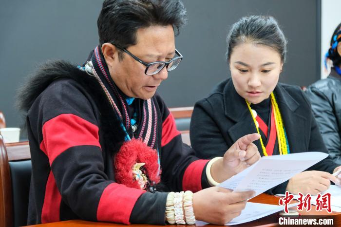 1月9日,西藏自治區(qū)兩會現場,兩位珞巴族政協(xié)委員林勇(左)和布姆曲珍進行討論、交流。中新社記者 江飛波 攝